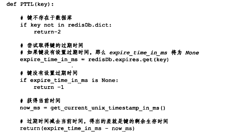 TTL和PTTL两个命令都是通过计算键的过期时间和当前时间之间的差来实现的,以下 是这两个命令的伪代码实现: