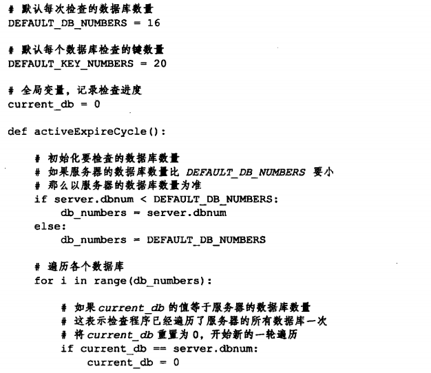 过期键的定期删除策略由redis.c/activeExpireCycle函数实现,每当Redis的 服务器周期性操作redis.c/serverCron函数执行时,activeExpireCycle函数就会被调用,它在规定的时间内,分多次遍历服务器中的各个数据库,从数据库的expires字 典中随机检查一部分键的过期时间,并删除其中的过期键。