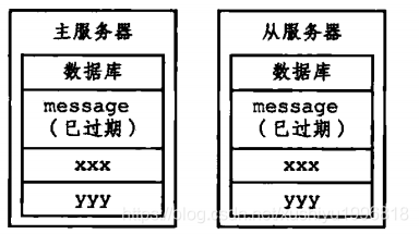 举个例子,有一对主从服务器,它们的数据库中都保存着同样的三个键message、XXX和yyy, 其中 message为过期键,如图