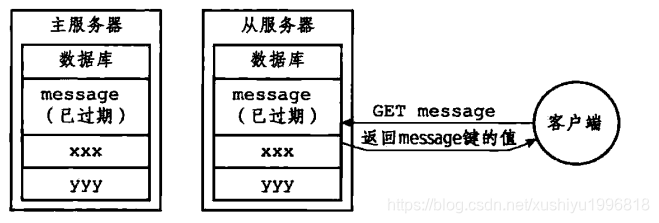 如果这时有客户端向从服务器发送命令GET message, 那么从服务器将发现message 键巳经过期,但从服务器并不会删除message键,而是继续将message键的值返回给客 户端,就好像message键并没有过期一样,如图