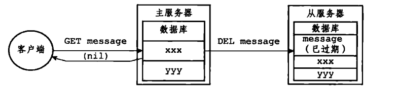假设在此之后,有客户端向主服务器发送命令GET message, 那么主服务器将发现键 message已经过期:主服务器会删除message键,向客户端返回空回复,并向从服务器 发送DEL message命令,如图所示。