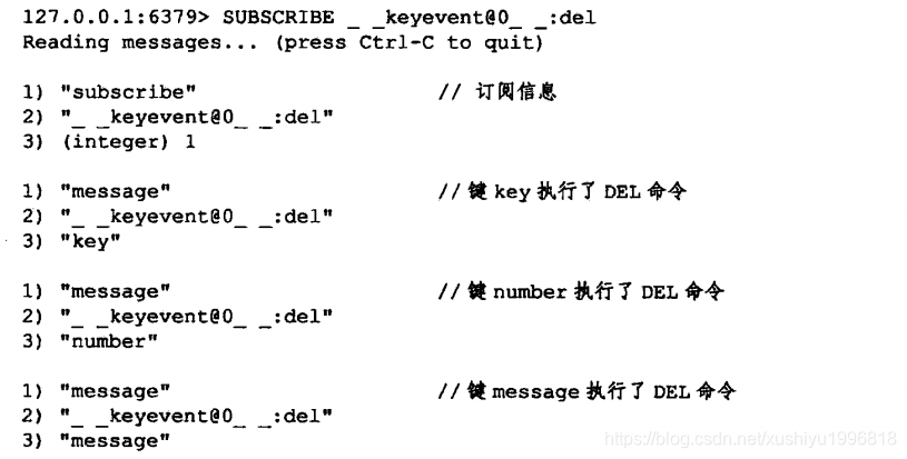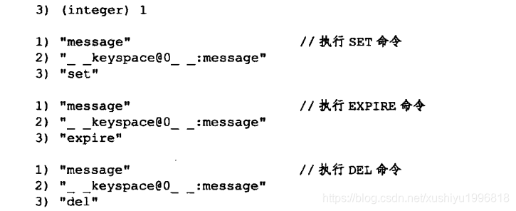 根据发回的通知显示,先后共有SET、EXPIRE、DEL三个命令对键message进行了 操作。