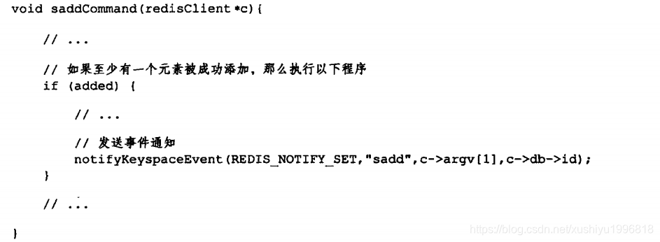 其他发送通知的函数调用notifyKeyspaceEvent函数的方式也和saddCommand、 delCommand类似,只是给定的参数不同,接下来我们来看看notifyKeyspaceEvent 函数的实现。