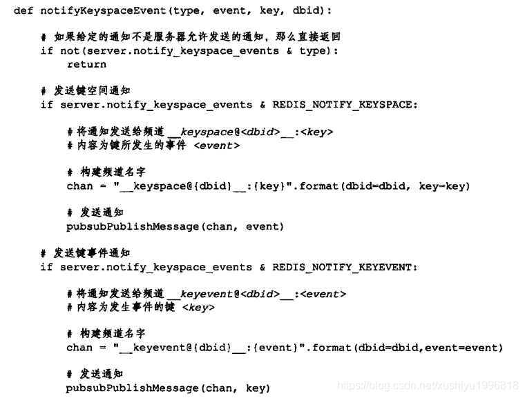 1) server.notify_ keys pace_ events属性就是服务器配置notify-keyspaceevents选项所设置的值,如果给定的通知类型type不是服务器允许发送的通知类型,那 么函数会直接返回,不做任何动作。