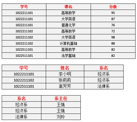 - 每一名学生的学号、姓名、系名、系主任这些数据重复多次。每个系与对应的系主任的数据也重复多次——数据冗余过大