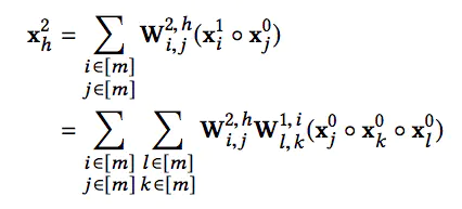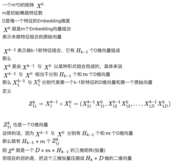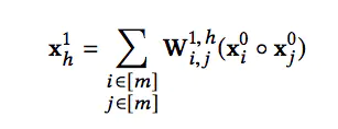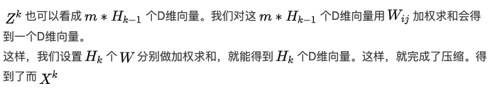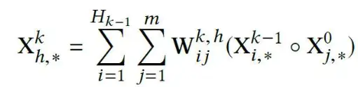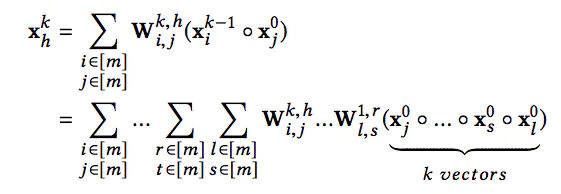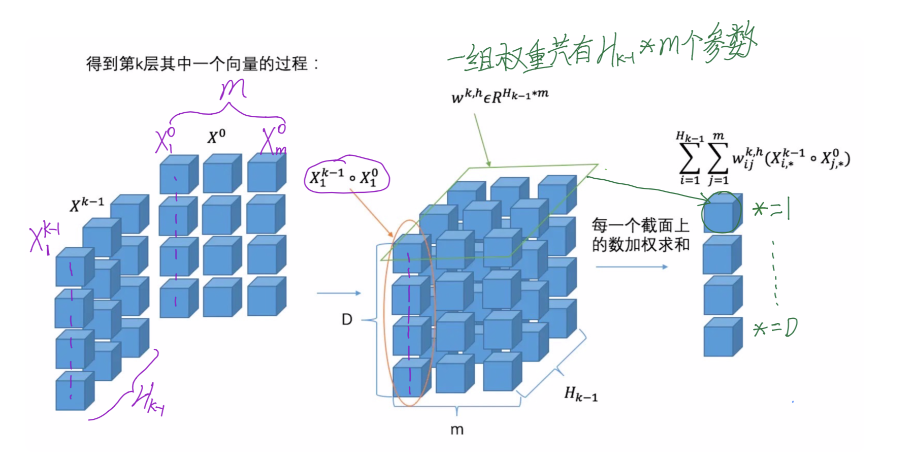 可以看到,CIN是通过(vector-wise)来学习特征之间的交互的,还有一个问题,就是它为什么是显式的进行学习?我们先从X1 来开始看,X1 的第h个神经元向量可以表示成下式,其中h是固定的,i=1~m, j=1~m,