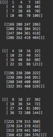 这里我理解的,tensorflow对3维及以上矩阵相乘时,矩阵相乘只发生在最后两维。也就是说,3 * 2 * 4 * 1 和 3 * 2 * 1 * 4的矩阵相乘,最终的结果是3 * 2 * 4 * 4。我们来看看结果: