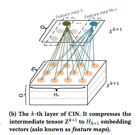 在这个中间结果上,我们用H^k+1 个尺寸为 m*Hk 的卷积核生成下一层隐层的状态,该过程如图2所示。这一操作与计算机视觉中最流行的卷积神经网络大体是一致的,唯一的区别在于卷积核的设计。CIN中一个神经元相关的接受域是垂直于特征维度D的整个平面,而CNN中的接受域是当前神经元周围的局部小范围区域,因此CIN中经过卷积操作得到的特征图(Feature Map)是一个向量,而不是一个矩阵。