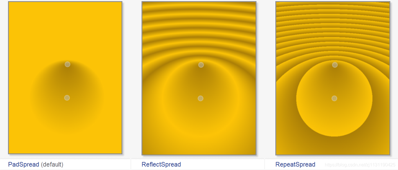 同时,QRadialGradient需要通过setSpread()函数设置延展方式,也就是填充区域意外的填充方式,共有三种方式: