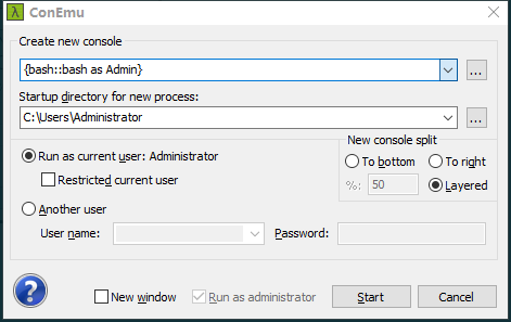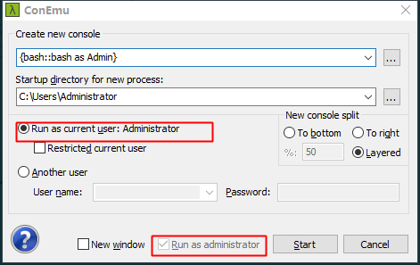 Ctrl + t勾选Run as current user和Run as administrator这两 项,然后点start开启,然后在命令行输入Cmder.exe /REGISTER ALL