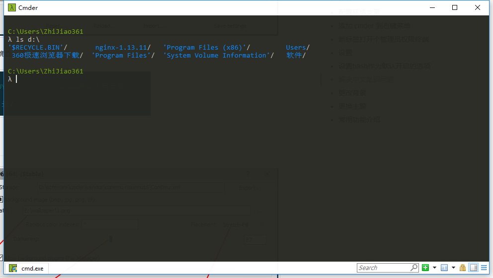 cmder还增加了alias功能,它让你用短短的指令执行一些常见但指令超长又难以记忆的语法;比如 ls cls等等