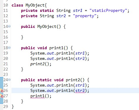 此时对象都没有,str2根本就不存在,所以就会产生矛盾了。同样对于方法也是一样,由于你无法预知在print1方法中是否访问了非静态成员变量,所以也禁止在静态成员方法中访问非静态成员方法。