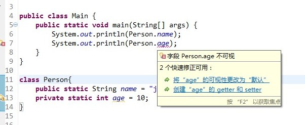 提示错误"Person.age 不可视",这说明static关键字并不会改变变量和方法的访问权限。