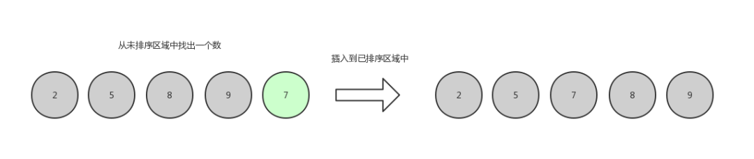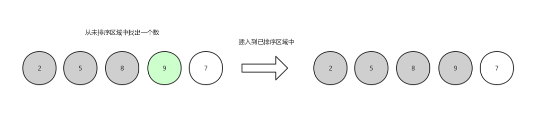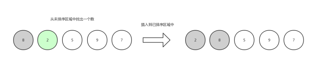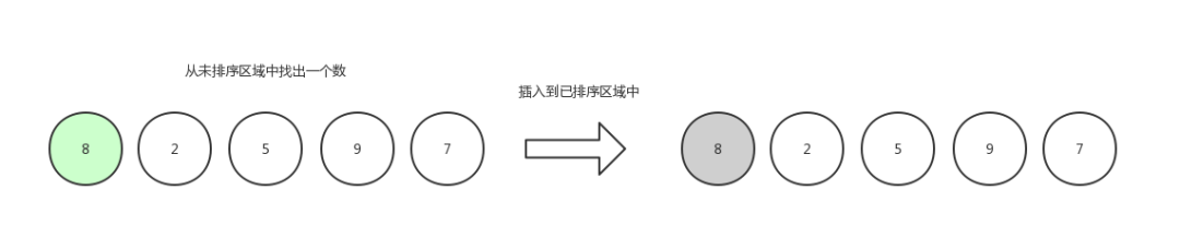 数组初始化:[ 8,2,5,9,7 ],我们把数组中的数据分成两个区域,已排序区域和未排序区域,初始化的时候所有的数据都处在未排序区域中,已排序区域是空。