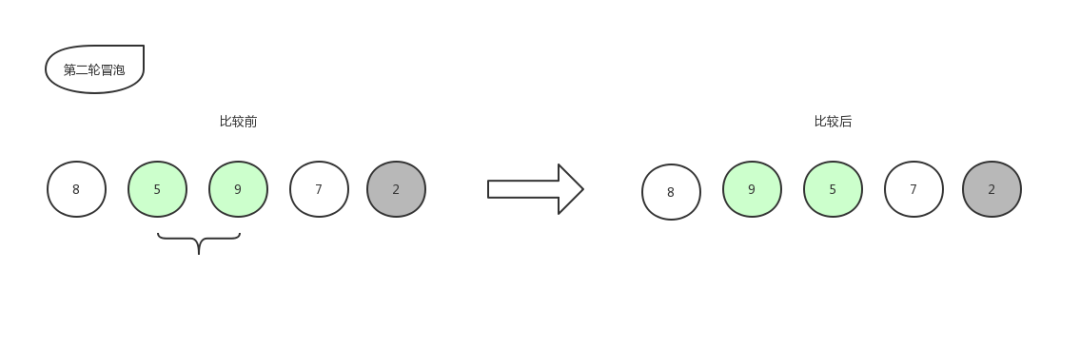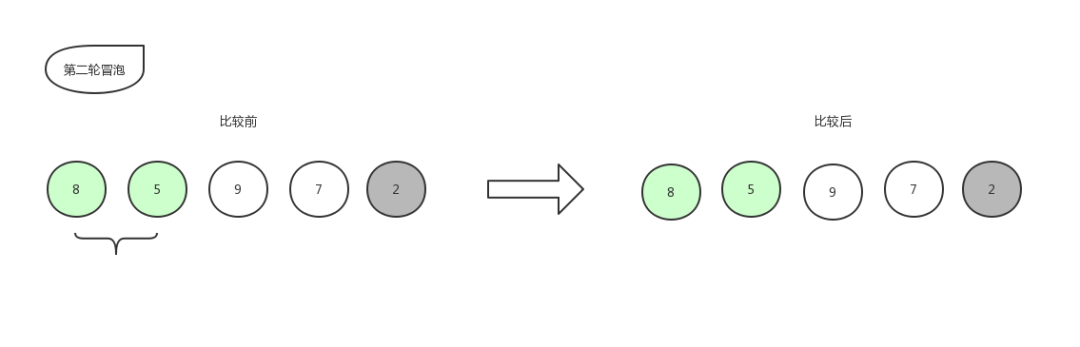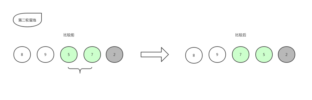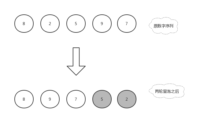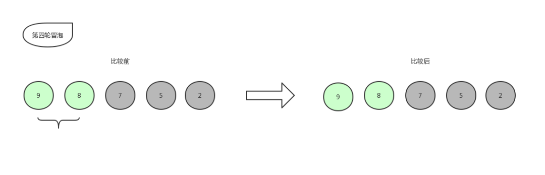 由于右边的 2 已经是排好序的数字,就不再参与比较,所以本轮冒泡结束,本轮冒泡最终冒到顶部的数字 5 也归于有序序列中,现在数组已经变化成了[ 8,9,7,5,2 ]。
