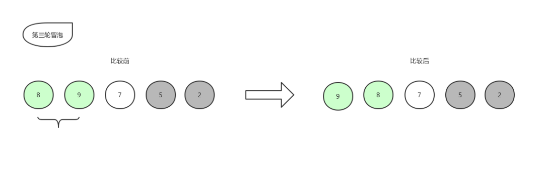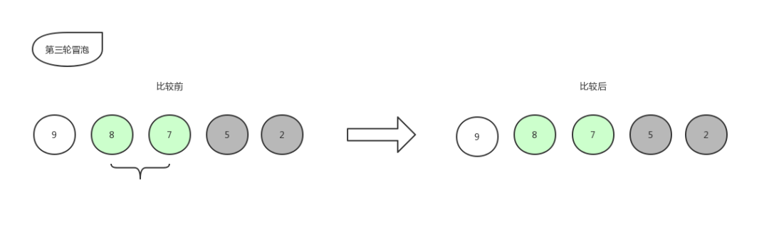 由于 8 比 7 大,所以位置不变,此时第三轮冒泡也已经结束,第三轮冒泡的最后结果是[ 9,8,7,5,2 ]