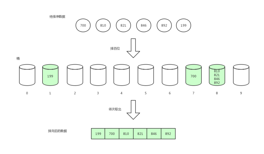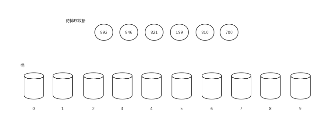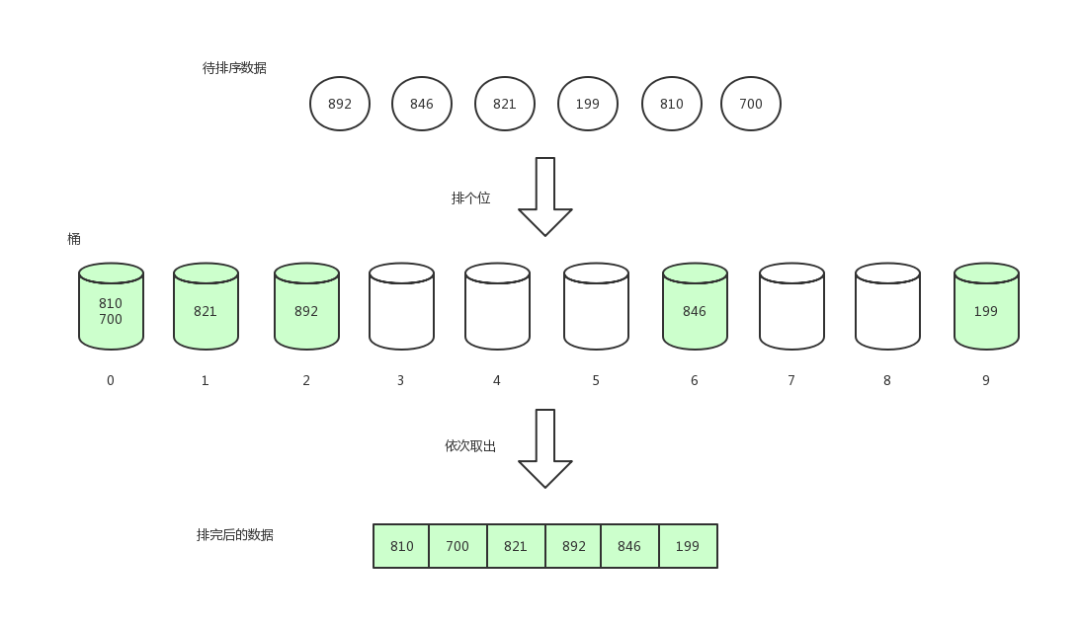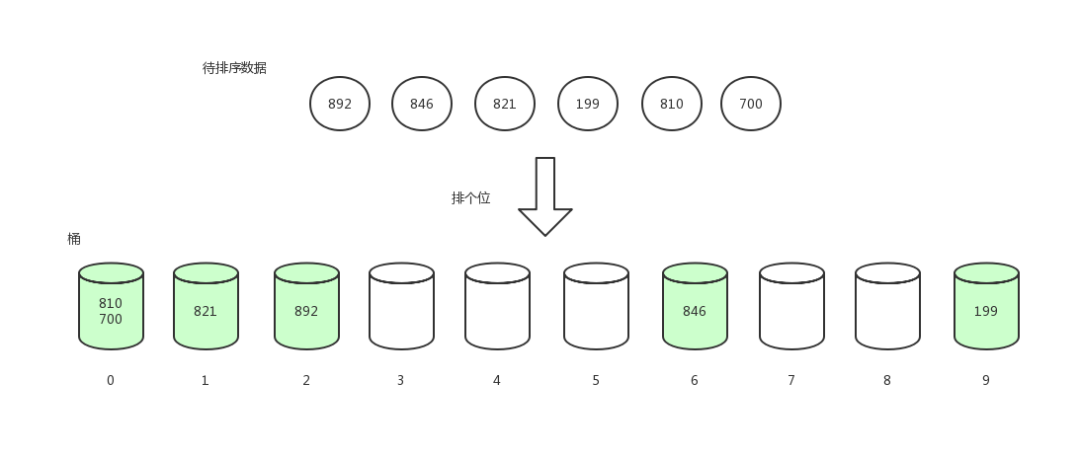 先排个位数,根据个位数的值将数据放到对应下标值的桶中。