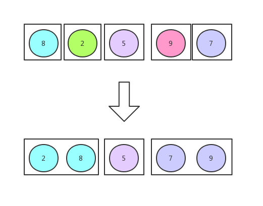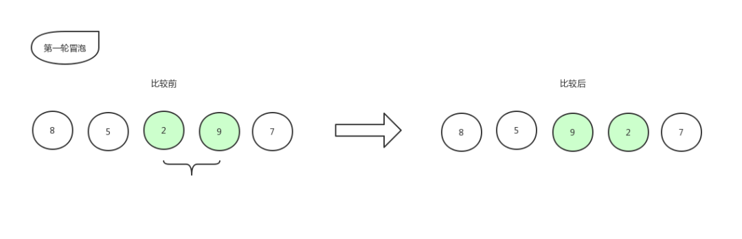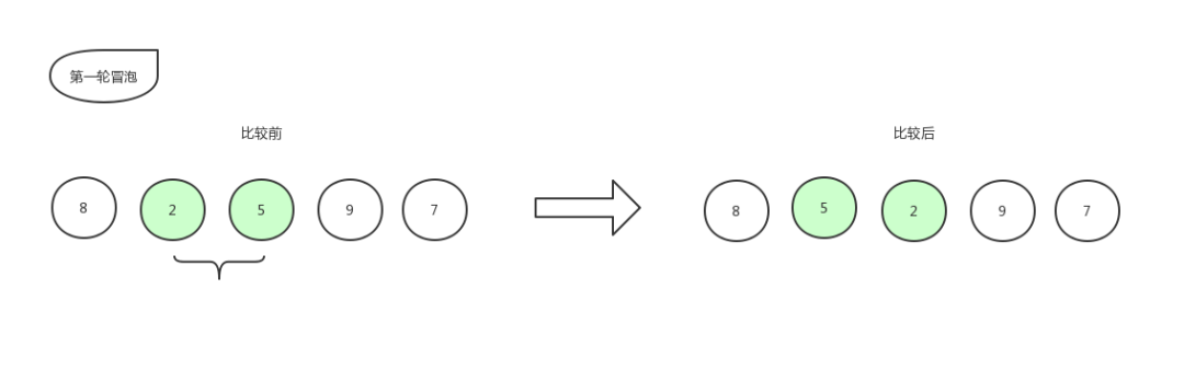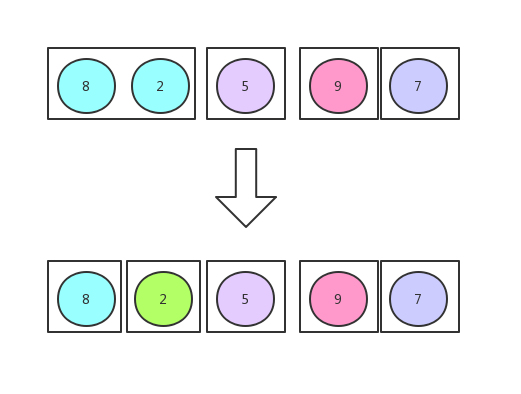 首先比较第一个数和第二个数的大小,我们发现 2 比 8 要小,那么保持原位,不做改动。位置还是 8,2,5,9,7 。