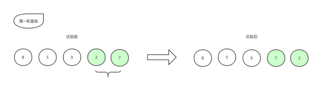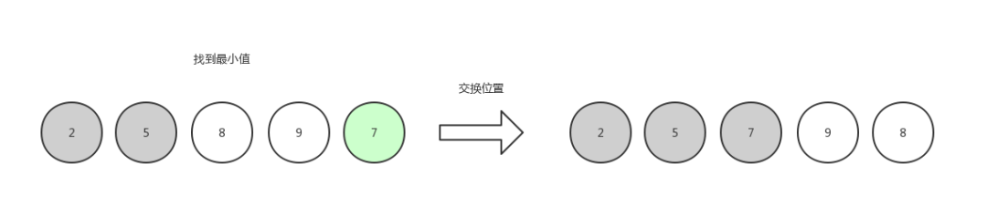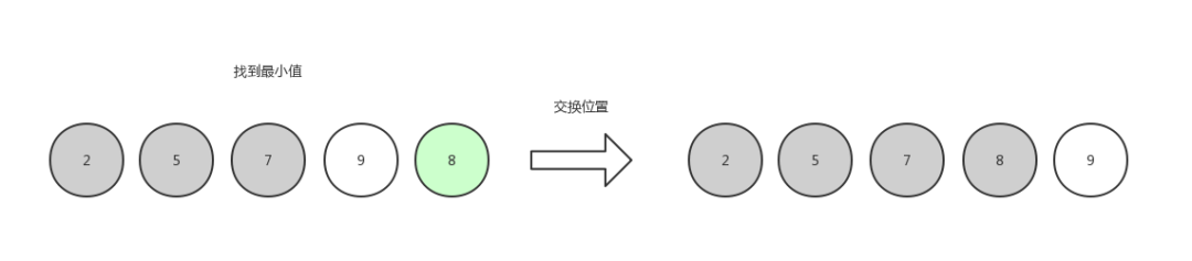 比较第 4 个数和第 5 个数的大小,发现 2 比 7 要小,所以位置交换,交换后数组更新为:[ 8,5,9,7,2 ]