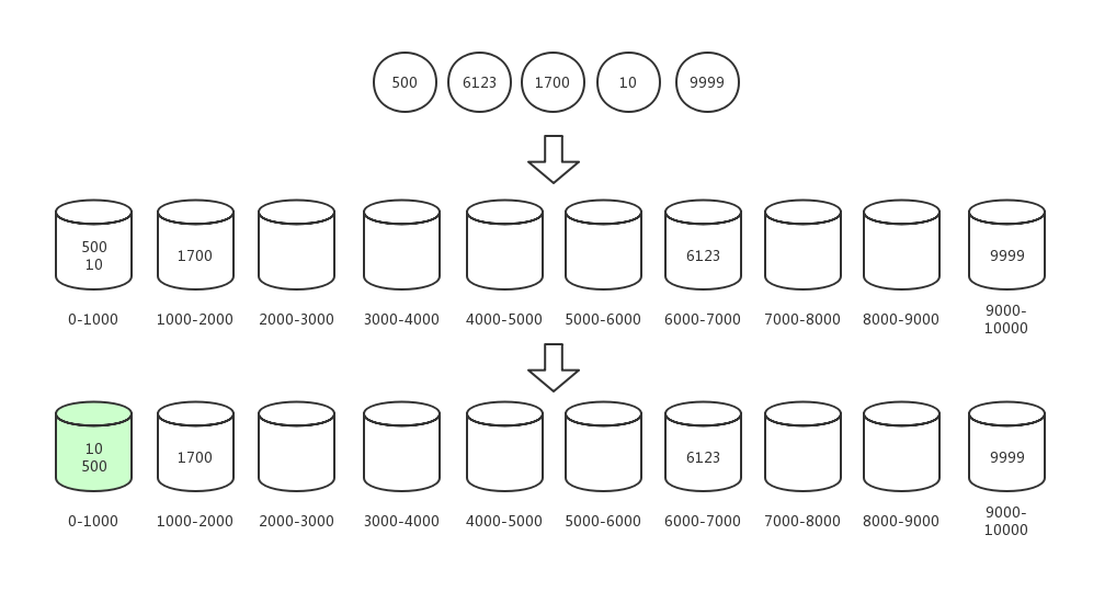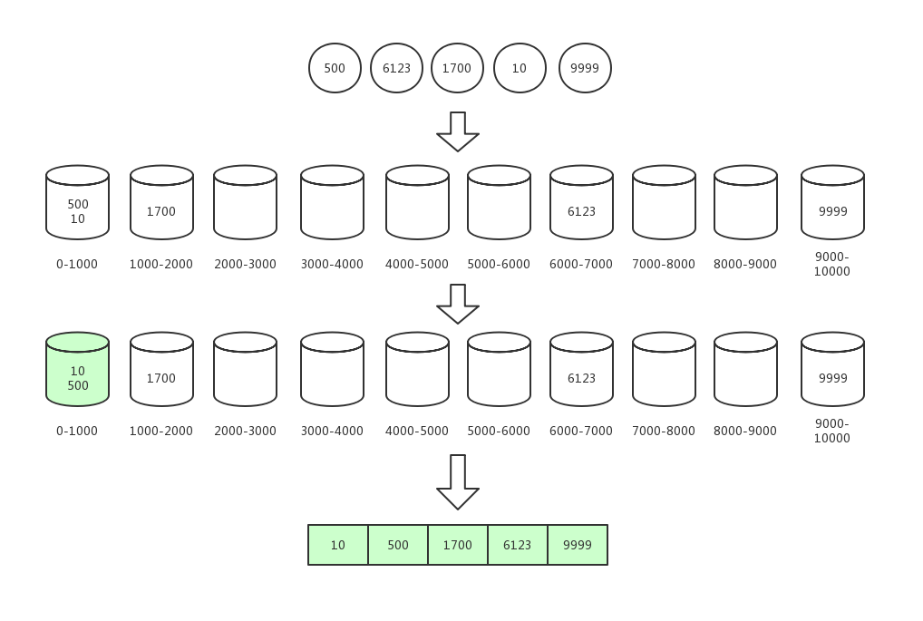 桶内排序为了方便起见使用了当前语言提供的排序方法,如果对于稳定排序有所要求,可以选择使用自定义的排序算法。