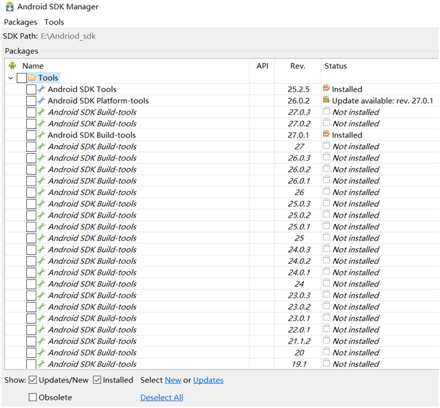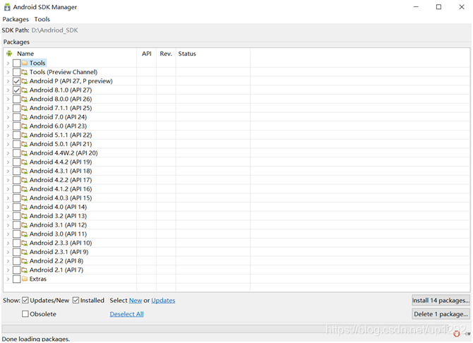 安装后启动 SDK Manager.exe 程序就可以看到Android SDK Mannerger的主界面。