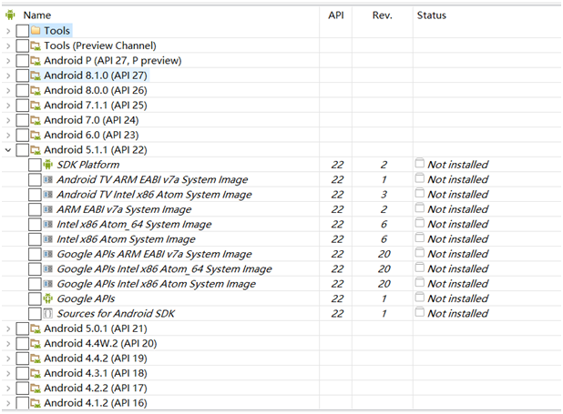 Android SDK Tools(必须,只需下载一个版本,一般选最新版本):基础工具包,版本号带rc字样的是预览版。