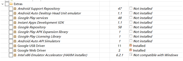 • Intel x86 Emulator Accelerator(HAXM installer)(可选):windows平台的Intel x86模拟器加速工具,配合Intel x86 atom/atom_64 System Image使用可加快模拟器的运行速度。
