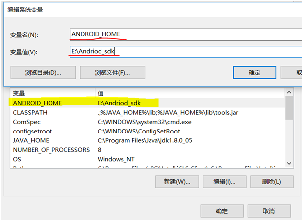 • 系统变量里面添加变量名 ANDROID_HOME 路径为实际存放SDk的路径