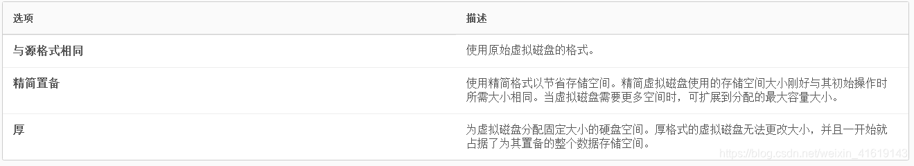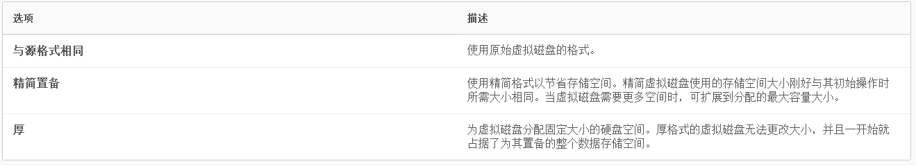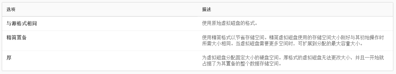 仅当将磁盘从一个数据存储复制到另一个数据存储时,才会将磁盘从精简格式转换到厚格式或从厚格式转换到精简格式。如果将磁盘保留在原始位置,则不管在此处作何选择,均不会转换磁盘格式。