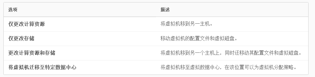 您可使用热迁移或冷迁移将虚拟机从一个主机或存储位置移至另一位置。例如,您可使用 vMotion 将已打开电源的虚拟机从主机上移开,以便执行维护、平衡负载、并置相互通信的虚拟机、将多个虚拟机分离以最大限度地减少故障域、迁移到新服务器硬件等等。