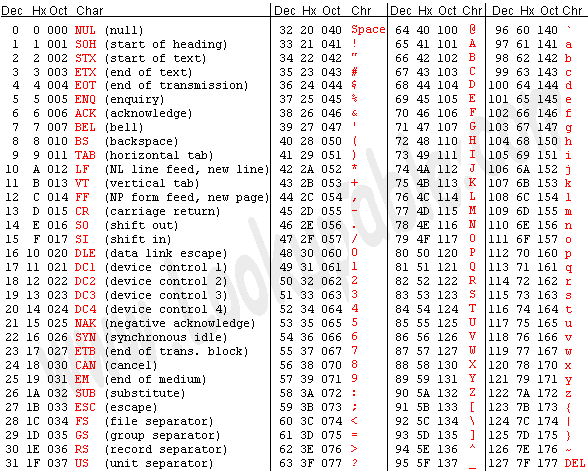 第0~32号及第127号(共34个)是控制字符或通讯专用字符,如控制符:LF(换行)、CR(回车)、FF(换页)、DEL(删除)、BEL(振铃)等;