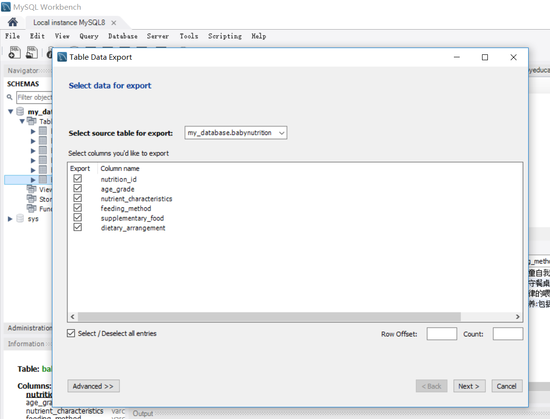 1、第一步,选中数据库表babynutrition,鼠标右键选择“数据导出”选项,打开导出弹窗,注意导出的数据格式