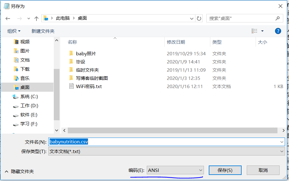 3,然后在文本编辑器里面选择另存为,在编码选择ansi编码,文件类型上选择所有类型,点击保存按钮,再直接覆盖原来的babynutrition.csv。
