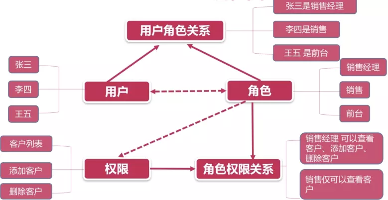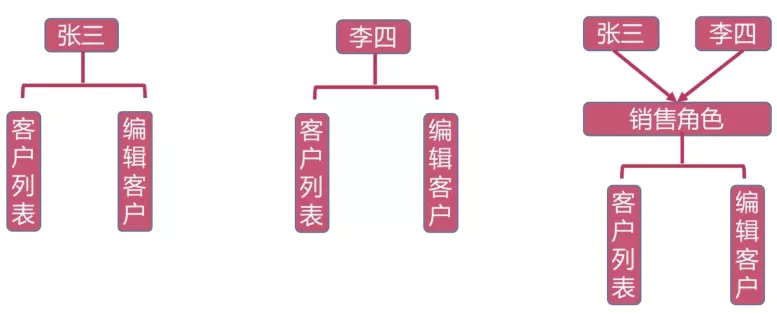 即,张三、李四是“销售角色”,而“销售角色拥有查看“客户列表”和“编辑客户”两个动作的权限,自然而然的,张三、李四就拥有查看“客户列表”和“编辑客户”两个动作的权限。