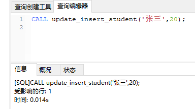 5、通过CALL update_insert_student('张三',20)语句执行存储过程,如下图所示: