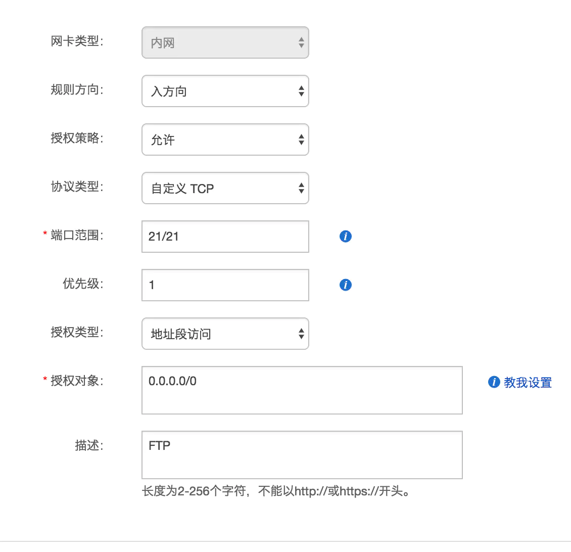 搭建好 FTP 站点后,您需要在实例的安全组的入方向添加一条放行 FTP 端口的规则。