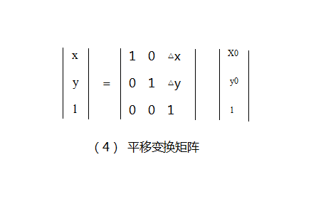 这也就是前面所说的实现平移过程的平移公式,图(4)所示矩阵也就是平移变换矩阵。