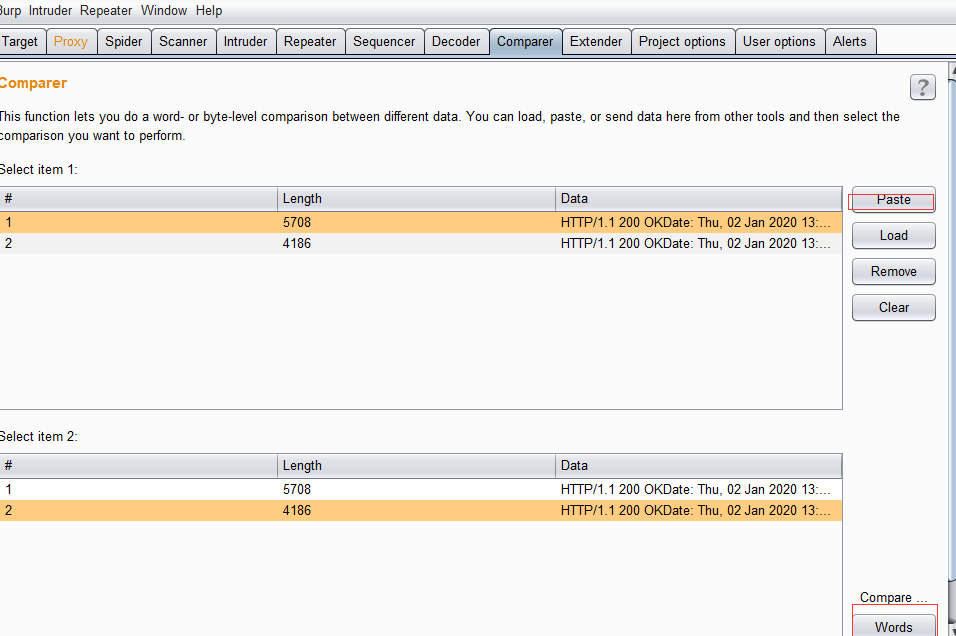 - 抓两个数据包,在repeatar处分别查看内容,将内容分别复制到comparer(paste复制)