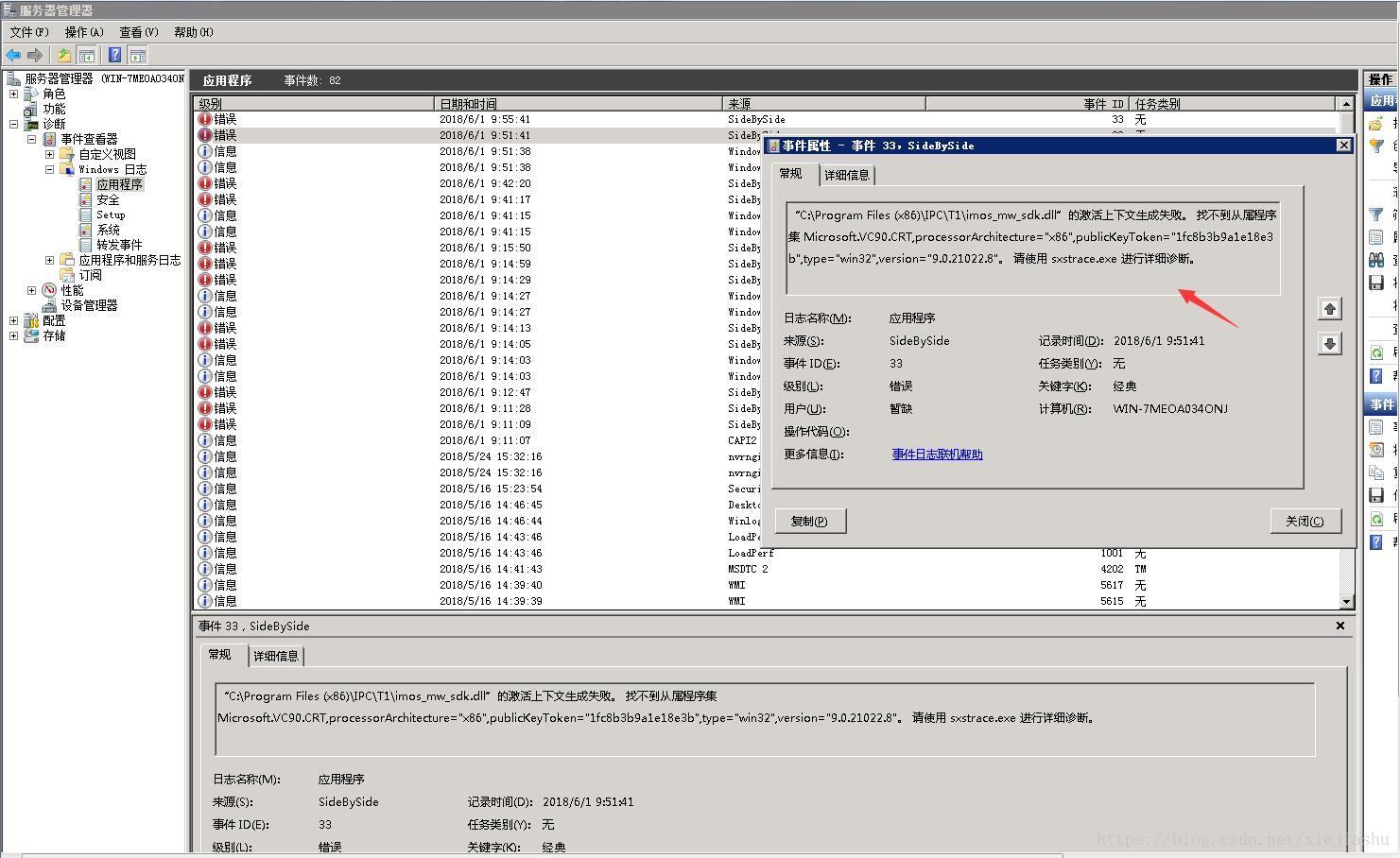 从日志系统来看,报错原因是imos_mv_sdk.dll缺少了Microsoft.VC90.CRT这个程序集,系统不带这个程序集,而安装程序又不自带进来,就导致了ocx注册出错。