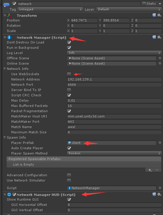 然后在network物体上添加上networkmananger组件和managerHUD组件。不需要其他的另外的脚本了。