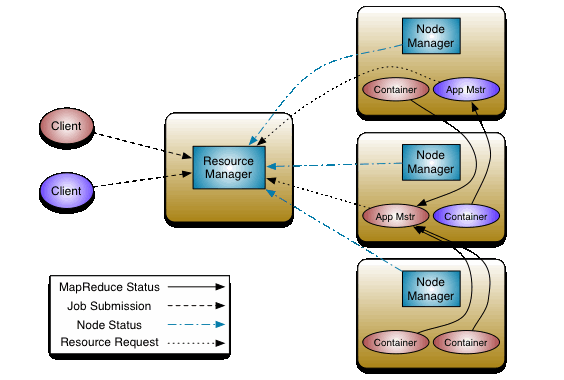 1. 屎黄色的框框代表一个节点也就是一台机器,这几个节点上运行着几个常驻进程,图片上蓝色背景的ResourceManager,NodeManager。