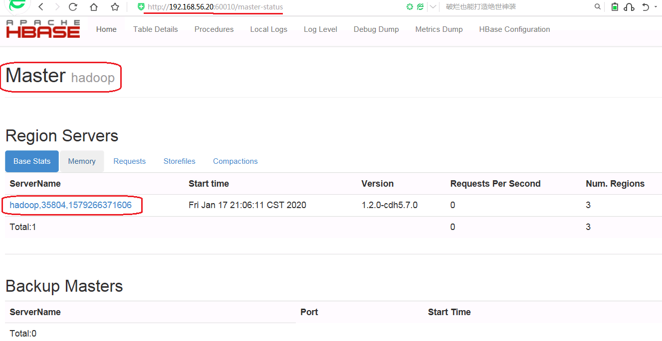 12)在win7下,用chrome浏览器访问HBase自带的web配置网站 http://192.168.56.20:60010 ,能出现如下页面说明访问成功: