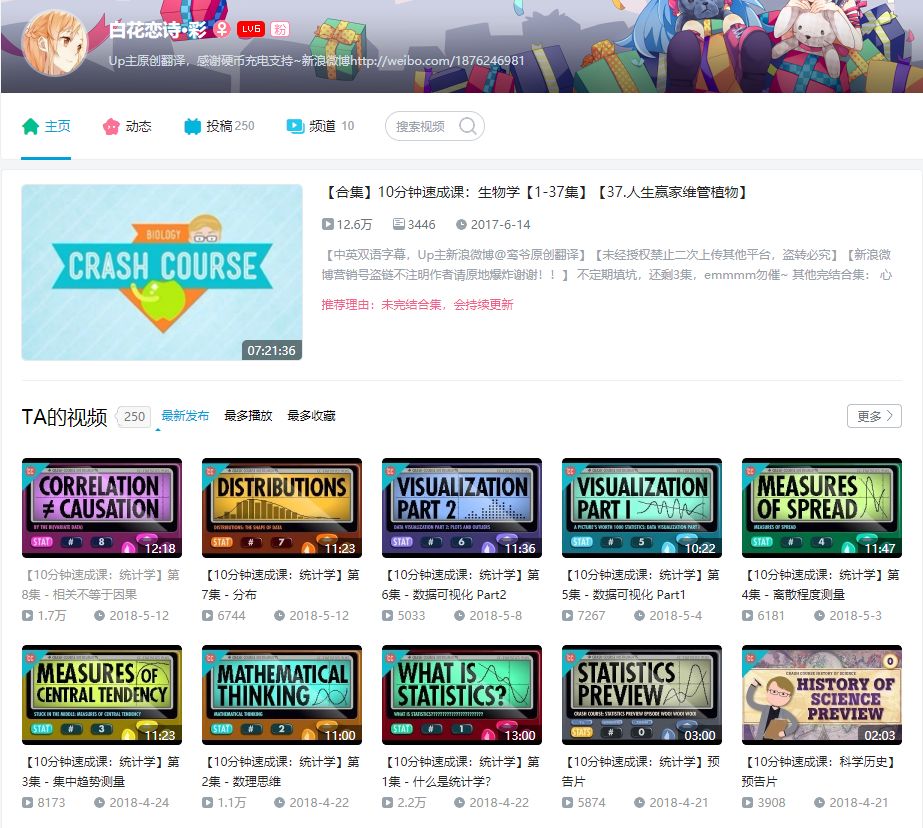 这些其它优秀课程范围很广,包括大历史、统计学、生物学、社会学、哲学、物理等等等等几十个学科系列,英语好的可以直接看英文的,英语不好的同学也不怕,可以去万能的 b 站,直接搜"10分钟速成课" 或者直接搜 b 站阿婆主“白花恋诗·彩”,大佬持续不断的翻译了好多,Orz...