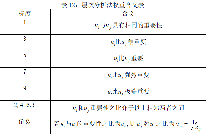 具有这种性质的矩阵称为正互反矩阵,下面给出权重表: