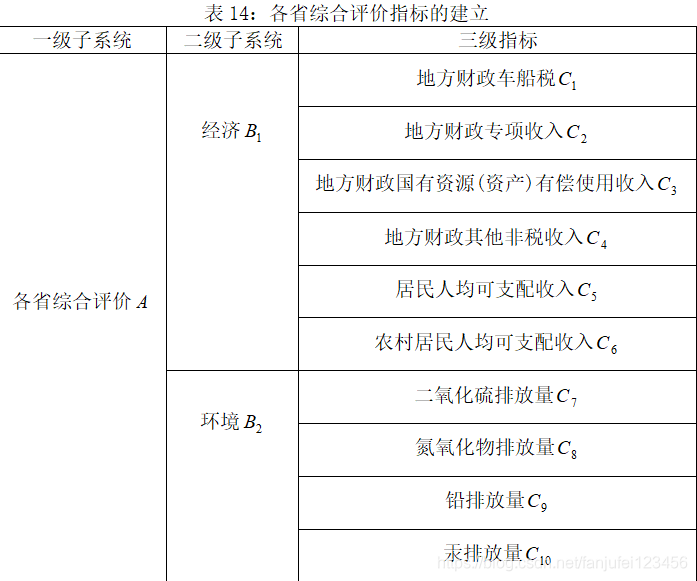 首先在国家统计年鉴上查找出各个省的经济经济指标和环境指标,可以把二者进行交互在一起,共同构成经济和环境的三级指标层次分析评价模型,模型的建立经济方面选取指标为地方财政车船税(亿元)、地方财政专项收入(亿元)、地方财政国有资源(资产)有偿使用收入(亿元)、地方财政其他非税收入(亿元)、居民人均可支配收入(元)、居民人均可支配收入(元),环境方面选取的指标为二氧化硫排放量(吨)、氮氧化物排放量(吨)、铅排放量(千克)、汞排放量(千克)。