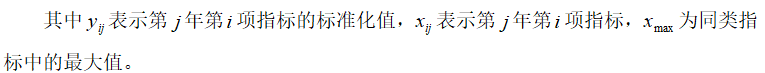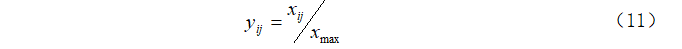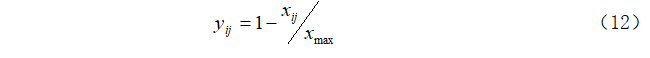 由于原始数据量纲各不相同,不能直接数学模型计算,为方便我们采用最大值法进行评价,具有正相关的指标标准化计算公式为: