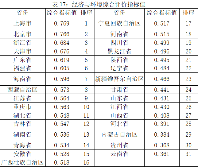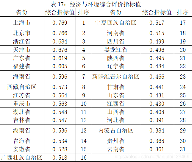 根据以上步骤可以得出如下各省份经济和环境的综合指标排序情况,以经济和环境的权重系数都为0.5,根据以上得出排序指标如下: