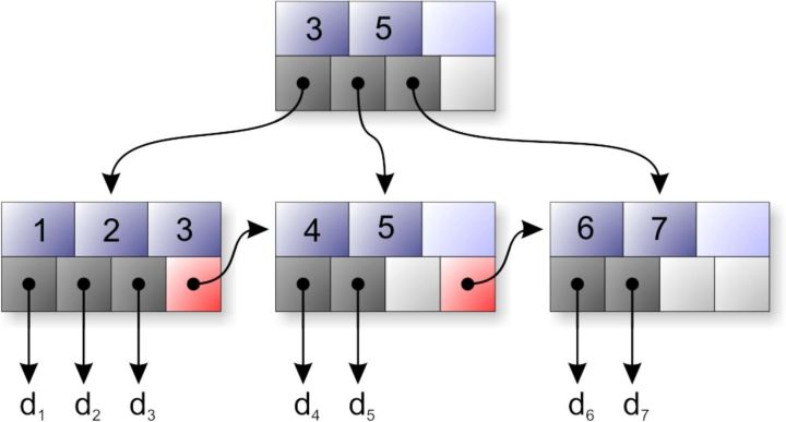 - 叶子节点存放数值,并按照值大小顺序排序,且带指向相邻节点的指针,以便高效地进行区间数据查询;并且所有叶子节点与根节点的距离相同,因此任何查询的效率都很相似。