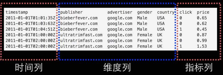 - 指标列( Metric):指标对应于 OLAP概念中的 Fact,是用于聚合和计算的列。这些指标列通常是一些数字,计算操作通常包括 Count、Sum和 Mean等。